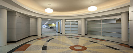 Featured in the new interior office space is an open corridor. The corridors starts at the new addition, runs through the open area office partitions and connects into the ceiling and floor “Ellipse” which highlights the building’s renovated reception and conference room area. The Ellipse consists of a drywall drop ceiling soffit with cove lighting and a reflective “Toli” multicolored sheet vinyl floor which mimics the ceiling layout. CBC (America) is a distributor of “Toli” goods for the nation’s northeast region. The area is enclosed in white milk-colored glass with aluminum-colored millwork which is also installed in a radial pattern. This area leads to the east side reception area, waiting rooms, board room and conference rooms.