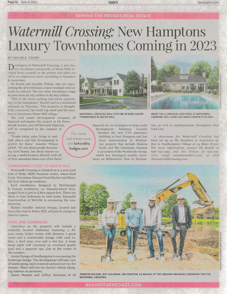 Developers of Watermill Crossing, a new luxury townhome community in Water Mill, recently broke ground on the project and sales are off to an impressive start, according to Saunders & Associates.